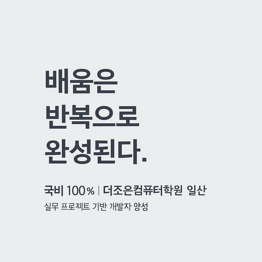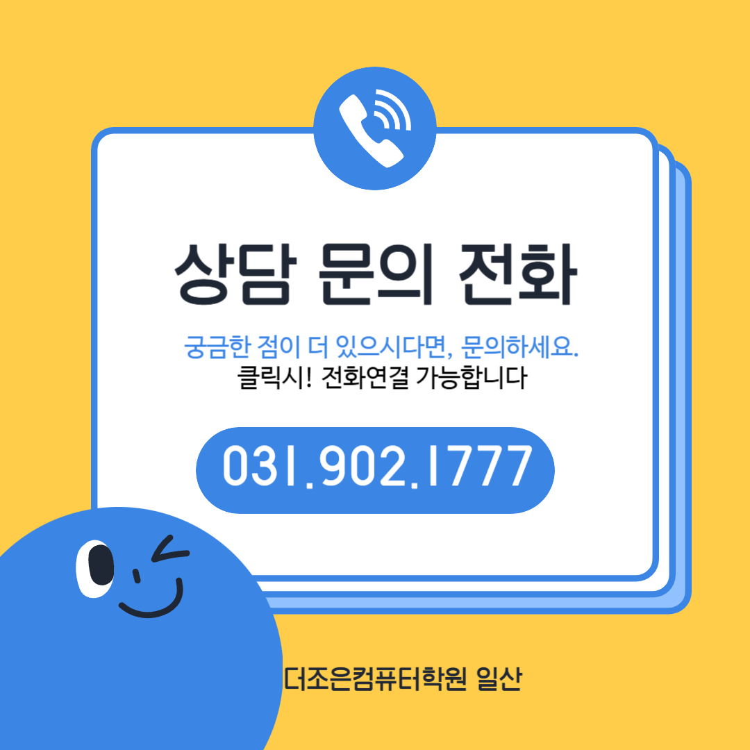 웹퍼블리셔, 자바, 파이썬 등 프로그래밍 교육까지 포함된 커리큘럼으로 커리어를 확장하고자 한다면, 지금 바로 더조은컴퓨터학원 일산캠퍼스 상담을 받아보세요. 블로그 상담 링크 또는 전화 상담을 통해 상세 안내가 가능합니다.